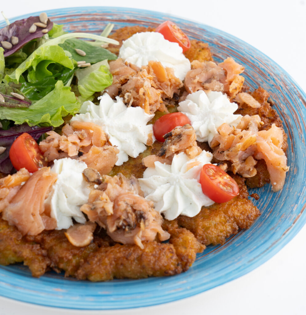Placek ziemniaczany z wędzonym łososiem