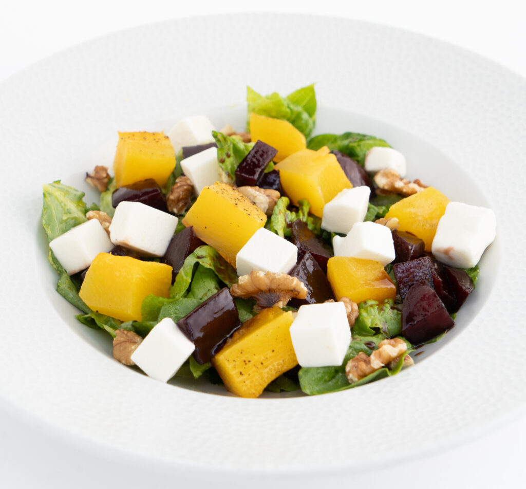 ser camembert / burak / pieczarki / orzechy / pędy groszku